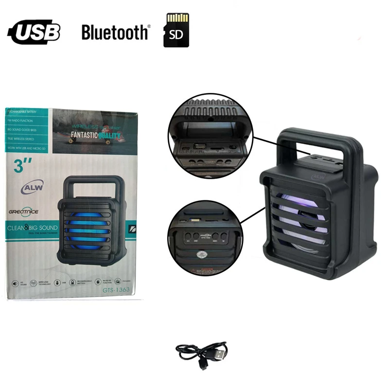 اسپیکر بلوتوثی قابل حمل مدل GTS-1363 اسپیکر پرتابل GTS-1363 را می توان به شکل ایستاده به کار برد و علاوه بر بلوتوث، با کارت حافظه، فلش مموری سازگاری دارد و همچنین وجود یک ساب 3 اینچی باعث شده است تا بتوانید ازقدرت صدای شگفت انگیزبهره ببرید.اسپیکر بلوتوث مدل GTS-1363 سری FANTASTIC با کیفت عالی و ورودی TF،USB که صدایی با کیفیت در اختیار کاربر قرار می دهد. رقص نور ویژگی شگفت انگیز دیگر این اسپیکر، وجود رقص نوررنگی در هنگام پخش موزیک است.که باعث زیبا تر شدن فضا میشود و لذت گوش دادن به موسیقی را چند برابر میکند - قابلیت ویژه دیگر اسپیکر GTS-1363وجود فناوری TWS یا همان اتصال همزمان دو دستگاه با مدل یکسان برای قدرت صدای بیشتر می باشد. برای اتصال همزمان دو دستگاه به گوشی موبایلتان کافی ست دکمه M برای چند ثانیه نگه دارید تا ارتباط برقرار شود. - نحوه ی اتصال به صورت بی سیم توسط بلوتوث با محدوده ی عملکرد 10 متر بدون مانع ، با پشتیبانی از فلش مموری (USB) و رم میکرو SD جهت پخش موسیقی - حداکثر حجم حافظه قابل پشتیبانی 32 گیگابایت، پاسخ فرکانسی در محدوده ی 100 هرتز الی 20 کیلوهرتز به منظور پوشش صداهای زیر و بم - باتری درایورهای داخلی این بلندگو بی سیم، قدرتی برابر 10 وات برای آن رقم می زنند و با هر بار شارژ کامل باتری 800 میلی آمپر ساعتی آن امکان 2 ساعت پخش مداوم موزیک با ولوم 50% در اختیارتان خواهد بود. - رادیو از ویژگی های دیگر اسپیکر وایرلس جی تی اس مدل GTS-1363می توان به رادیوی FM، برد 10 متری و پخش صدای استریو اشاره کرد. - جنس بدنه از پلاستیک با کیفیت، دارای دسته جهت حمل آسان و مناسب - دارای کلیدهای فیزیکی جهت روشن و خاموش کردن، مدیریت موسیقی و … - امکان شارژ مجدد دستگاه توسط پورت MicroUSB و کابل همراه